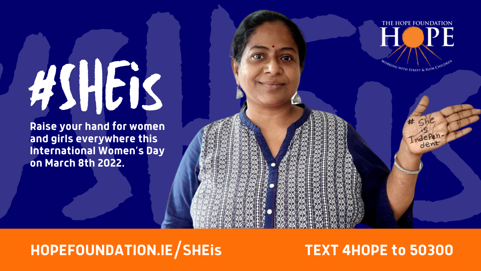 On International Women’s Day Hope is asking its supporters to raise a hand for women and girls everywhere and to share out their photos on social media. “We have asked our staff, supporters, ambassadors and members of the public to take a photo or short video with #SHEis followed by a word written on their hand that means something to them, not only with regards to HOPE’s support of Indian girls and women, but also supporting the message of IWD this year which is gender equality for today for a sustainable tomorrow”, said Jennifer Foran Smyth, Fundraising & Communications Manager for The Hope Foundation.