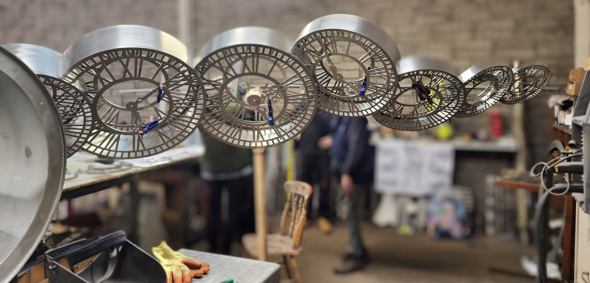 The evening will commence at 8 pm on the Plaza with a pre-celebration for the winter solstice meanwhile, at 8:15 at the Museum of Time at Greyfriars where a very special new outside clock, named Tempus Fugit (Time Flies) will be unveiled by the Mayor of Waterford Cllr. John O’Leary, horologists David Boles and Colman Curran and a representative of Fáilte Ireland. The clock, which has been designed by artists Eithne Ring and Liam Lavery of Cork and created by Keating Fabrication in Waterford, is an elaborate design featuring wings spanning about six metres; the wings are made up of seven steel dials each. It will chime on the hour and once the sun sets visitors can admire the colourful lighting on the wings and main clock face.